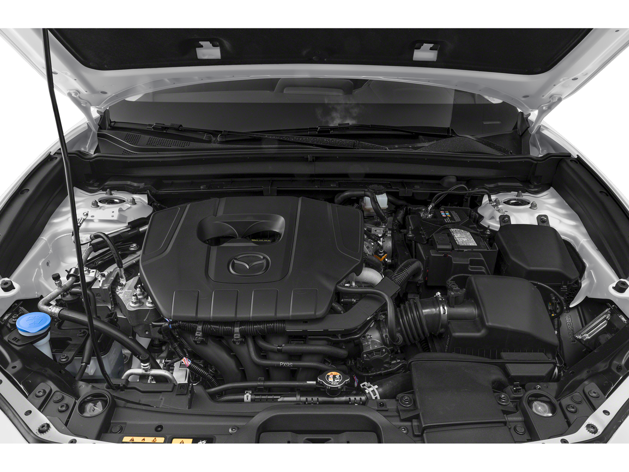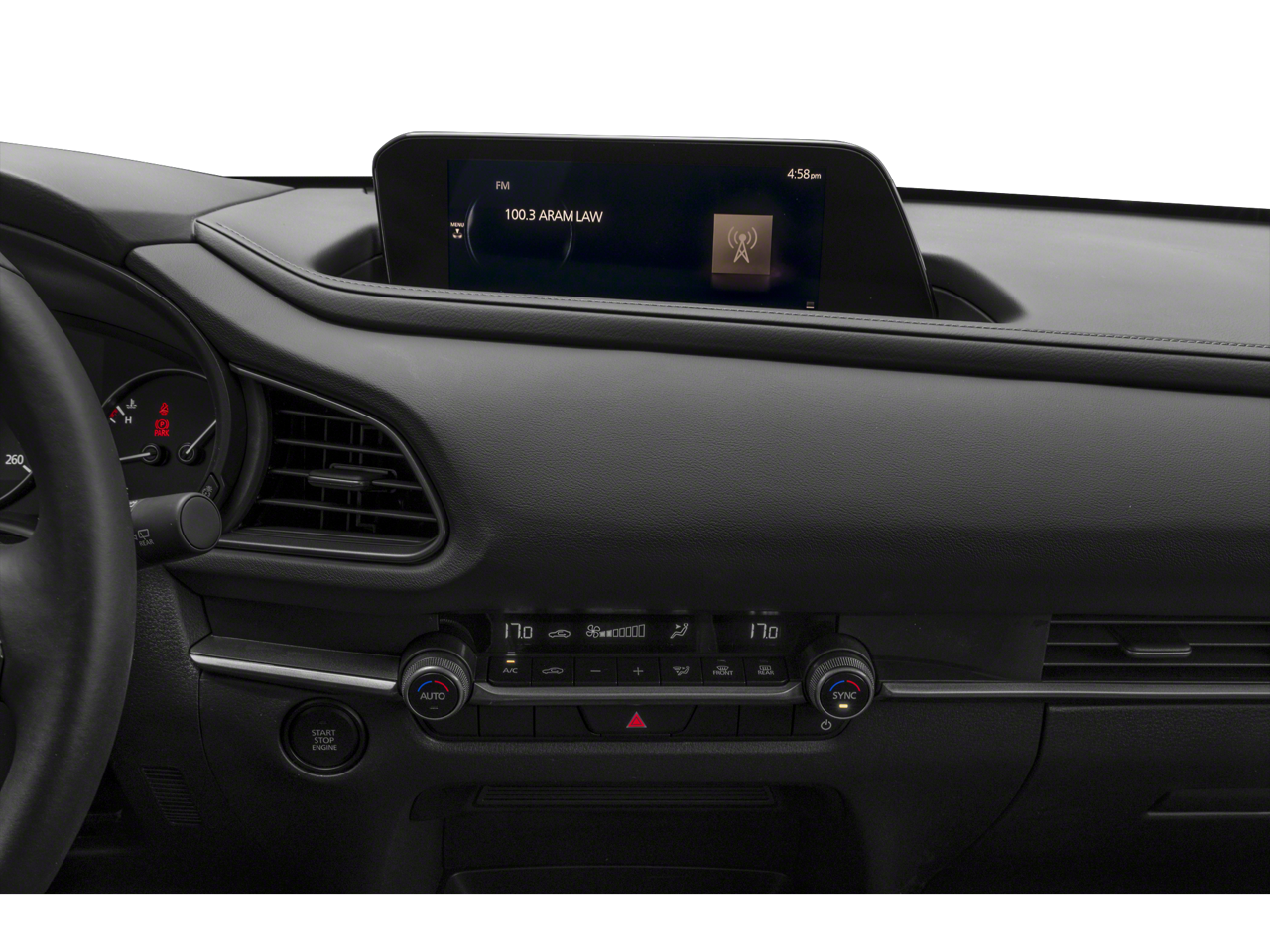 Equipped with 4-Wheel Disc Brakes, 6 Speakers, ABS brakes, Air Conditioning, Alloy wheels, AM/FM radio, AppLink/Apple CarPlay and Android Auto, Auto High-beam Headlights, Automatic temperature control, Brake assist, Bumpers: body-color, Compass, Delay-off headlights, Driver door bin, Driver vanity mirror, Dual front impact airbags, Dual front side impact airbags, Electronic Stability Control, Emergency communication system: Mazda Connected Services (3-year trial subscription included), Exterior Parking Camera Rear, Front anti-roll bar, Front Bucket Seats, Front Center Armrest, Front dual zone A/C, Front reading lights, Front wheel independent suspension, Fully automatic headlights, Heated door mirrors, Illuminated entry, Knee airbag, Leather Shift Knob, Leather steering wheel, Leatherette Seat Trim, Low tire pressure warning, MAZDA CONNECT Infotainment System, Occupant sensing airbag, Outside temperature display, Overhead airbag, Overhead console, Panic alarm, Passenger door bin, Passenger vanity mirror, Power door mirrors, Power steering, Power windows, Radio data system, Radio: AM/FM Audio System, Rain sensing wipers, Rear seat center armrest, Rear side impact airbag, Rear window defroster, Rear window wiper, Remote keyless entry, Speed control, Speed-sensing steering, Split folding rear seat, Spoiler, Steering wheel mounted audio controls, Tachometer, Telescoping steering wheel, Tilt steering wheel, Traction control, Trip computer, Turn signal indicator mirrors, Variably intermittent wipers, and Wheels: 18 x 7J Aluminum Alloy.